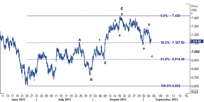 در حرکت نزولی نفوذ قیمت به زیر سطح ۷۰۸۱٫۵۰ ( پایین ترین سطح روز ۳۰ اوت) موجب تایید شکست سطح حمایت ۷۱۰۸ و سقوط قیمت به سوی سطح حمایت بعدی یعنی سطح ۶۹۱۴ ( بر روی خط فیبوناچی ۶۱٫۸ درصدی) می شود. بررسی امواج الیوت نشان می دهد که قیمت در موج نزولی c قرار گرفته است که می تواند به اندازه ی طول موج قبلی a حرکت نماید. تا به حال موج c نیمی از حرکت خود را کاهش داشته است.