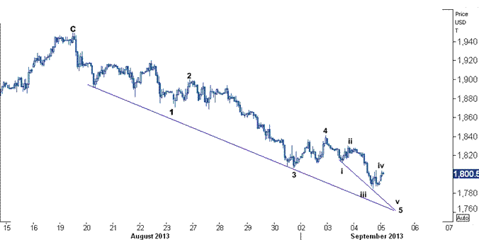 با نگاهی دقیق تر به نمودار پایین متوجه می شویم که خط روند نزولی کوچکی که از محل برخورد کف موجهای i و iiiبه یکدیگر وصل شده هدف ۱۷۶۰ را مشخص ساخته است و حتی خط روند نزولی بزرگی که رسم شده همین هدف را نشانه گرفته است.