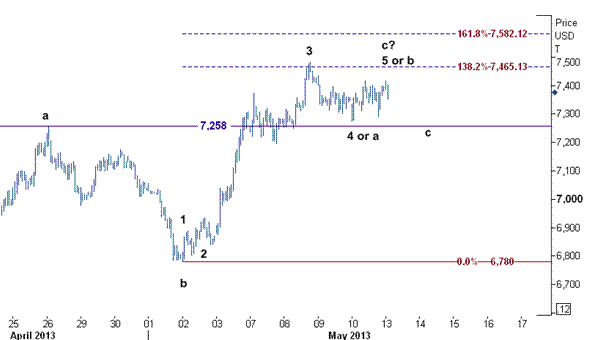 این سطح مقاومت بر روی خط فیب ۱۳۸٫۲ درصدی از موج افزایشی c که از سطح ۶۷۸۰ ( پایین ترین سطح روز ۲ مه ) آغاز شده قرار دارد و به این دلیل است که مس قادر به صعود و عبور از سطح مقاومت ۷۴۶۵ نیست .