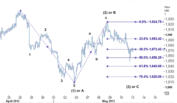این موضوع نشان می دهد که سیگنال نزولی بلند مدت همچنان پایدار است و سطح ۱۸۰۹ دیر یا زود شکسته خواهد شد. همچنین در چارت پایین مشاهده می شود که قیمت در موج نزولی (۳) یا موج بزرگ نزولی C قرار گرفته است که در اطراف سطح حمایت ۱۸۵۶ ( سطح فیب ۵۰ درصدی ) متوقف شده است که البته از این سطح حمایت هر گونه حرکت برگشتی و اصلاحی محدود به سطح مقاومت ۱۸۷۲ ( سطح فیب ۳۸٫۲ درصدی ) خواهد بود.