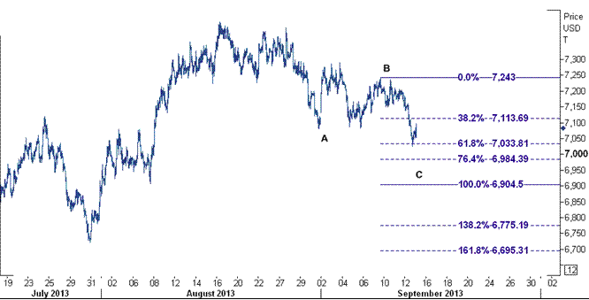این سطح مقاومت بر روی خط فیبوناچی ۳۸٫۲ درصدی از موج نزولی C قرار دارد که از سطح ۷۲۴۳ ( بالاترین سطح روز ۹ سپتامبر) شروع شده است و در این موج قادر است حتی تا سطح ۶۹۰۵ ( بر روی خط فیبوناچی ۱۰۰ درصدی) سقوط کند.