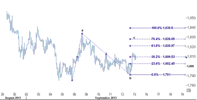 براساس تحلیل سطوح فیبوناچی این موج c می تواند تا نرخهای نزدیک البته زیر سطح ۱۸۴۰ ( خط فیبوناچی ۱۰۰ درصدی) افزایش یابد. البته ذکر این نکته ضروری است که برای امروز هر گونه حرکت نزولی محدود به سطح ۱۸۰۲ ( بر روی خط فیبوناچی ۲۳٫۶ درصدی) می باشد.