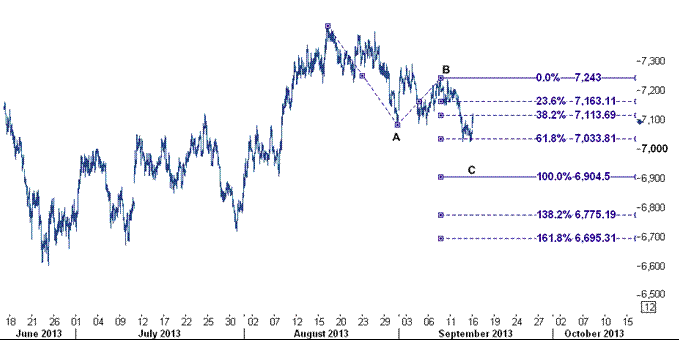این حرکت برگشتی پس از برخورد قیمت به سطح حمایت ۷۰۳۴ ، خط فیبوناچی ۶۱٫۸ درصدی از موج نزولی C که از سطح ۷۲۴۳ – بالاترین سطح روز ۹ سپتامبر – آغاز شده بود اتفاق افتاد و سطح مقاومتی که بر روی ۷۱۱۴ ( خط فیبوناچی ۳۸٫۲ درصدی) قرار دارد فعلا مانع از افزایش و اصلاح بیشتر قیمت شده است.