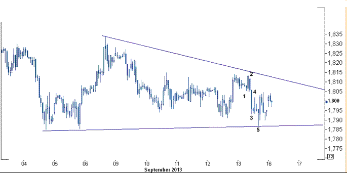 در حرکت کاهشی نفوذ قیمت به زیر سطح ۱۷۸۵ موجب تایید سناریوی نزولی خواهد شد که می تواند هدف ۱۷۷۰ را نمایان سازد و از سوی دیگر افزایش قیمت به بالای سطح ۱۸۱۳ موجب گسترش موج اصلاحی آغاز شده از سطح ۱۷۸۵ ( پایین ترین سطح ۴ سپتامبر) به سوی هدف ۱۸۳۳٫۷۵ ( بالاترین سطح روز ۶ سپتامبر) می شود.