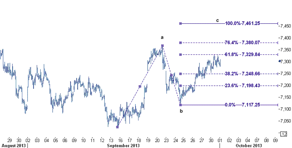 در هر حال فعلا سطح مقاومتی که بر روی خط فیبوناچی ۶۱٫۸ درصدی واقع شده است مانع از افزایش قیمت به سوی خط فیبوناچی ۷۶٫۴ درصدی شده است در این میان، بر روی نمودار ساعتی، الگوی افزایشی موج c شکل گرفته که احتمال شروع حرکت افزاشی به سوی ۷۴۶۱ را قوی می سازد.