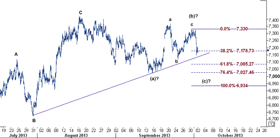 از منظر تحلیل تکنیکال و امواج الیوت این سومین موج از چرخه سه موجی می باشد که از سطح ۷۴۲۰ ( بالاترین سطح روز ۱۶ اوت) شروع شده است و براساس طول موج اولی یعنی موج (a) و همچنین موج (c) می تواند هدف حدود ۶۹۳۴ ( خط فیبوناچی ۱۰۰ درصدی) را مشخص سازد که در نمودار زیر به وضوح مشخص است.