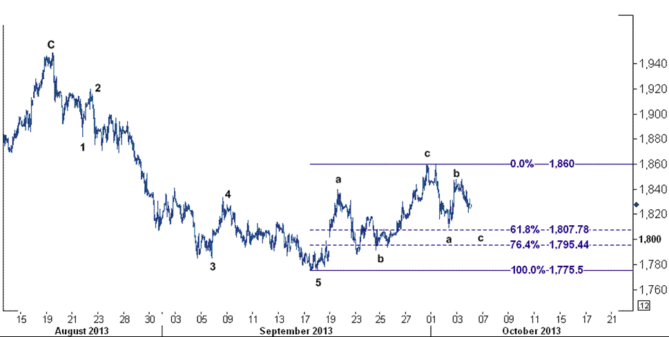در نمودار زیر مشخص است که این سطح حمایت بر روی خط فیبوناچی ۶۱٫۸ درصدی از حرکت اصلاحی ۱۷۷۵٫۵۰ ( کمترین سطح روز ۱۷ سپتامبر) به ۱۸۶۰ ( بالاترین سطح روز دوشنبه ) تشکیل شده است که موجب برگشت قیمت به سطح ۱۸۴۸ ( بالاترین سطح روز پنجشنبه ) گردید.