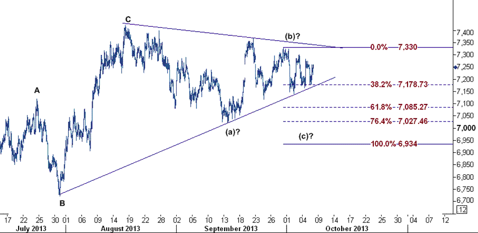 بنابراین به اعتقاد ما گذر از این سطوح نیاز به مومنتوم بالایی دارد که با تجمیع این انرژی قطعا یکی از این سطوح با قدرت شکسته خواهد شد . نفوذ قیمت به بالای سطح ۷۳۳۰ موجب صعود به سوی منطقه ۷۵۰۰ و نزول قیمت به زیر سطح ۷۱۷۹ موجب کاهش به سوی سطح ۷۰۸۵ دلار/تن می شود که این سطح بر روی خط فیبوناچی ۶۱٫۸ درصدی از موج نزولی (c) می باشد.