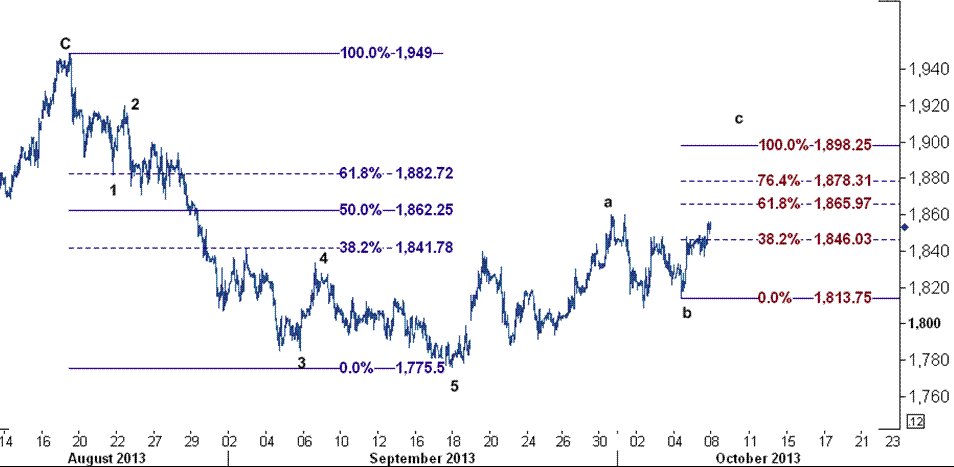 در نمودار زیر کاملا به وضوح مشخص است که این سومین موج از حرکت افزایشی سه موجی می باشد که از سطح ۱۷۷۵٫۵۰ ( پایین ترین سطح روز ۱۷ سپتامبر) شروع شده است و دیر یا زود انتظار داریم که در این موج تا حدود سطح ۱۸۹۸ ( خط فیبوناچی ۱۰۰ درصدی) تقویت شود.