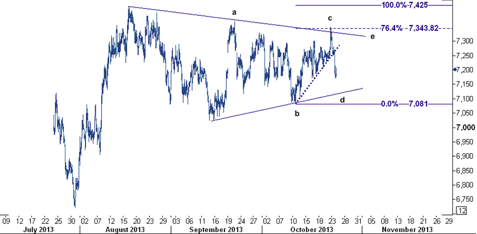 ضلع پایین این الگو هدف ۷۱۲۰ را نشان می دهد و به باور ما حرکت نزولی اخیر از سطح ۷۳۱۵ ( بالاترین سطح روز ۲۳ اکتبر) بسیار تند و سریع اتفاق افتاده است و احتمال برگشت و اصلاح قیمت به سوی خط روند افزایشی رسم شده از سطح ۷۰۸۱ ( پایین ترین سطح روز ۱۰ اکتبر) وجود دارد.