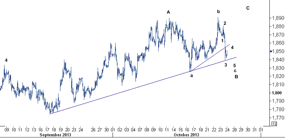 حرکت کاهشی قیمت از سطح ۱۸۹۱٫۲۵ ( بالاترین سطح روز ۲۲ اکتبر) در موج c است که به باور ما آخرین موج از چرخه سه موجی می باشد که از سطح ۱۸۹۰ (بالاترین سطح ۱۱ اکتبر) در نوسان است.