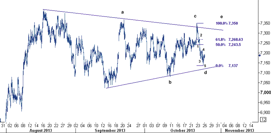 تحلیل و بررسی سطوح فیبوناچی از کاهش ۷۳۵۰ (بالاترین سطح ۲۲ اکتبر) به ۷۱۳۷ نشان می دهد که هدف امروز می توان در حدود سطوح ۷۲۴۴ تا ۷۲۶۹ باشد که این سطوح به ترتیب بر روی خط فیبوناچی ۵۰ درصدی و ۶۱٫۸ درصدی قرار دارند.