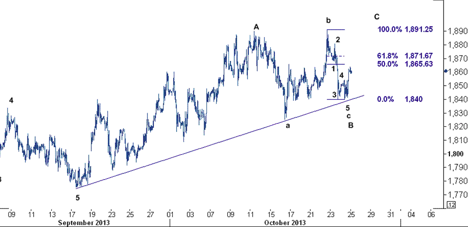 این حرکت برگشتی صرفا پس از برخورد قیمت به خط روند افزایشی رسم شده از سطح ۱۷۷۵٫۵۰ ( پایین ترین سطح روز ۱۷ سپتامبر) صورت گرفته و بررسی سطوح فیبوناچی از کاهش ۱۸۹۱٫۲۵ ( بالاترین سطح روز ۲۲ اکتبر) به ۱۸۴۰ نشان می دهد که مقاومت قوی در منطقه ۱۸۶۶ ( خط فیبوناچی ۵۰ درصدی) تشکیل شده است که این سطح مانع از اصلاح بیشتر قیمت می شود.