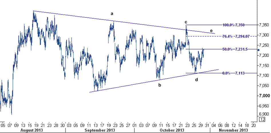 حرکت برگشتی قوی که از سطح ۷۱۱۳ ( پایین ترین سطح ۲۵ اکتبر) شروع شده بیانگر آن است که حرکت خنثی قیمت در دون الگوی گوه ادامه دار است . این الگو از روز ۱۶ اوت تشکیل شده است که شامل پنج موج در قالب موجهای a , b , c , d , e می باشد.