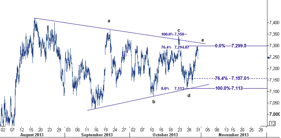 در هر حال همانطور که در نمودار زیر مشخص است حرکت پنج موجی قیمت در قالب موجهای a , b , c , d , e کامل شده است و برای امروز می بایست منتظر کاهش قیمت به سوی ضلع پایینی الگوی گوه یعنی حوالی سطح ۷۱۰۰ باشیم.