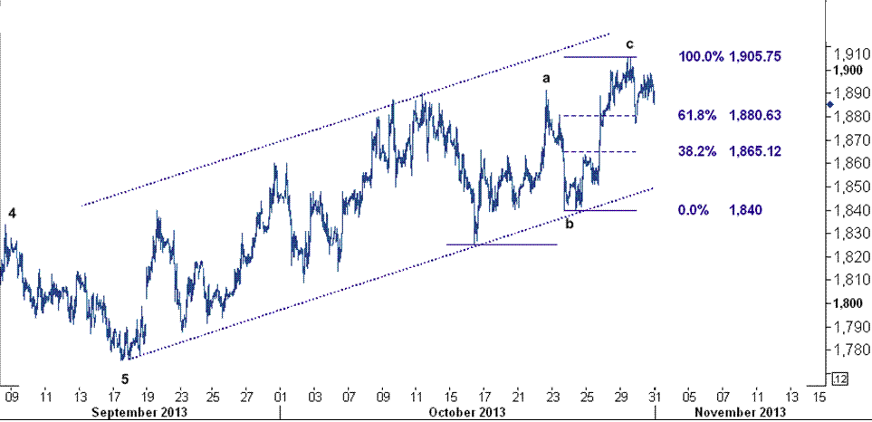 خط فیبوناچی ۶۱٫۸ درصدی بر روی نرخ ۱۸۸۱ به عنوان سطح حمایت قیمت عمل کرده که موقتا موجب برگشت و اصلاح جزئی قیمت شده است و این سطح فعلا مانع از کاهش قیمت به سوی سطح ۱۸۶۵ ( خط فیبوناچی ۳۸٫۲ درصدی) شده است.