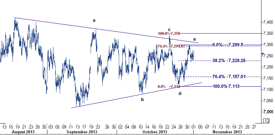 قیمت جهانی مس در بازار بورس فلزات لندن همچنان در دامنه باریک و خنثی در نوسان است و با حمایت قیمت در اطراف سطح ۷۲۲۸ دلار/تن روبرو است. این سطح حمایت همانگونه که در نمودار زیر دیده می شود بر روی خط فیبوناچی ۳۸٫۲ درصدی از حرکت افزایشی ۷۱۱۳ ( پایین ترین سطح ۲۵ اکتبر) به ۷۲۹۹٫۵۰ ( بالاترین سطح ۳۰ اکتبر) قرار گرفته است.