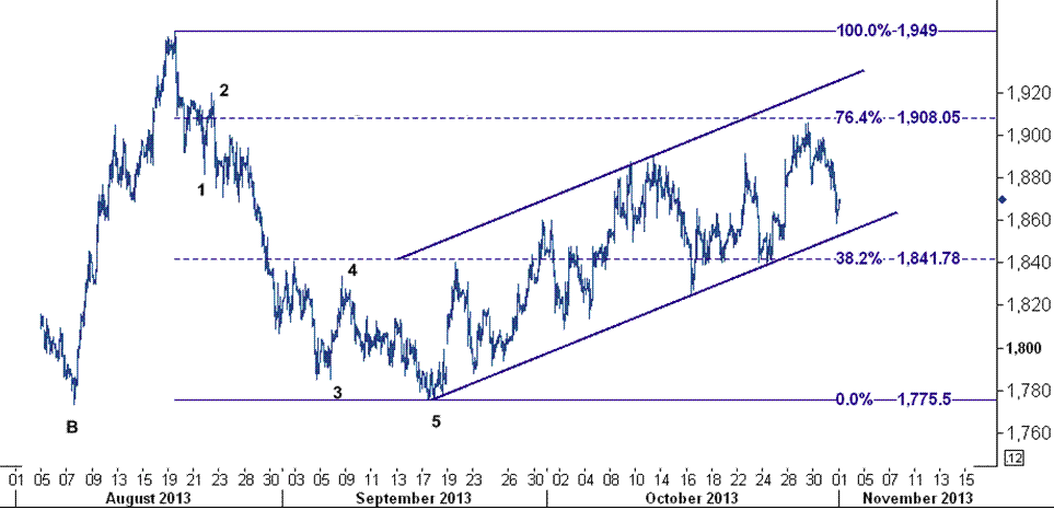 در نمودار زیر کاملا مشخص است که به محض رسیدن به سطح مقاومت ۱۹۰۸ قیمت آن شروع به برگشت و ریزش کرده است . این سطح مقاومت بر روی خط فیبوناچی ۷۶٫۴ درصدی از موج نزولی ۱۹۴۹ (بالاترین سطح ۱۹ اوت) به سطح ۱۷۷۵٫۵۰ قرار گرفته است.