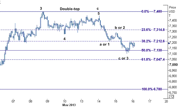 در صورت نفوذ قیمت به بالای سطح ۷۲۱۳ با توجه به تشکیل کف موقت قیمت در اطراف سطح ۷۱۳۰ موجب صعود قیمت به سطح ۷۳۱۵ ( سطح فیب ۲۳٫۶ درصدی ) خواهد شد. از سوی دیگر کاهش قیمت به زیر سطح ۷۱۳۰ موجب ادامه سیر نزولی قیمت از سطح ۷۴۴۲ ( بالاترین سطح روز سه شنبه ) به سوی ۷۰۴۷ ( سطح فیب ۶۱٫۸ درصدی ) خواهد شد. در هر صورت برای امروز قیمت مس بیشتر متمایل به افزایش است زیرا تحلیل و بررسی امواج الیوت از سطح ۷۴۴۲ به نظر اصلاح قیمت می رسد.