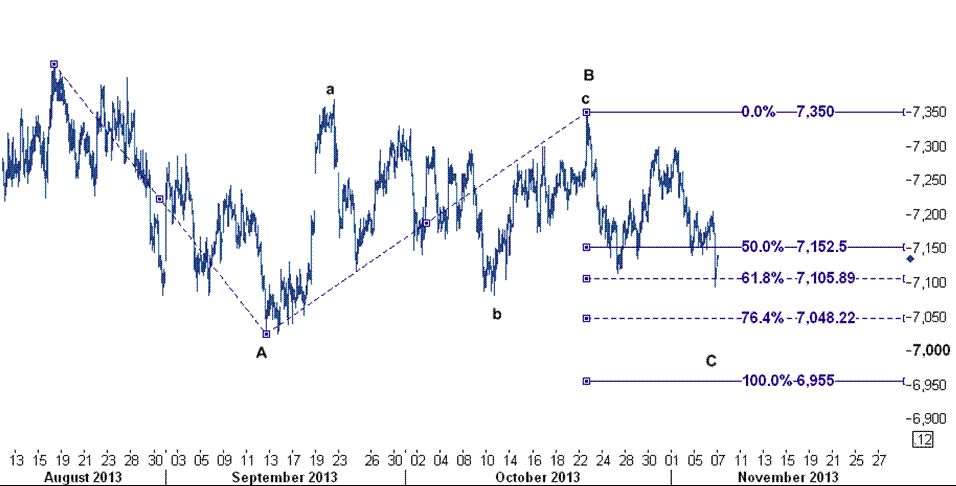 این سطح حمایت بر روی خط فیبوناچی ۶۱٫۸ درصدی از موج نزولی C قرار گرفته است که از سطح ۷۳۵۰ ( بالاترین سطح روز ۲۲ اکتبر) شروع شده است.