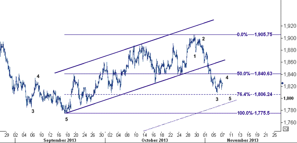 همانطور که در نمودار زیر مشخص است روند نزولی قیمت از سطح ۱۹۰۵٫۷۵ ( بالاترین سطح روز ۲۹ اکتبر) هنوز تکمیل نشده است و قیمت همچنان پتانسیل و فضای لازم برای کاهش بیشتر را دارد.