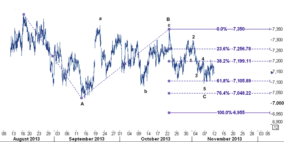 این سطح مقاومت بر روی خط فیبوناچی ۳۸٫۲ درصدی از موج نزولی C قرار دارد که از سطح ۷۳۵۰ ( بالاترین نرخ ۲۲ اکتبر) شروع شده است. ناتوانی قیمت در عبور از این سطح مقاومت نشان دهنده تکمیل موج برگشتی آغاز شده از سطح ۷۱۰۶ ( خط فیبوناچی ۶۱٫۸ درصدی) می باشد.