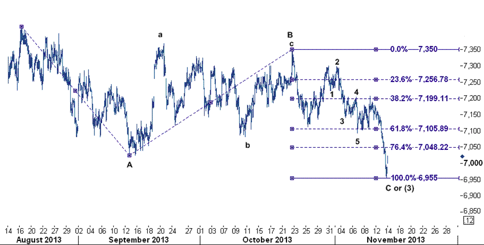 در نمودار قیمت جهانی مس همانطور که در نمودار زیر مشخص است قیمت آن با سطح حمایت ۶۹۵۵ دلار/تن روبرو است و برای معاملات امروز امکان بازگشت به سوی سطح ۷۰۴۸ وجود دارد. این سطح حمایت بر روی خط فیبوناچی ۱۰۰ درصدی از موج نزولی C که از سطح ۷۳۵۰ (بالاترین سطح ۲۲ اکتبر) شروع شده قرار دارد.