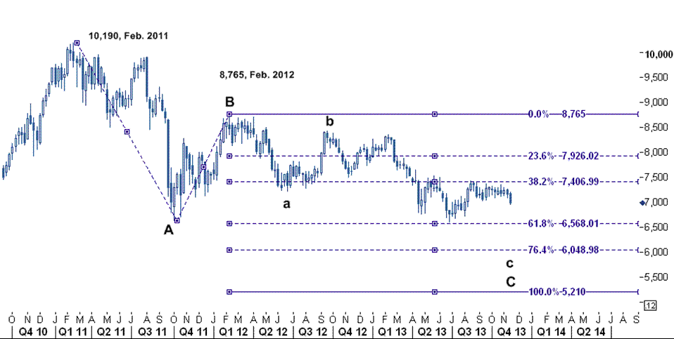 در نمودار دوم نیز چشم انداز قیمت جهانی مس در طی ۴ هفته آینده را نشان می دهد که انتظار داریم در یک ماهه آینده مجدد سطح ۶۶۰۲ ( پایین ترین سطح ۲۵ ژوئن) را لمس کند که این هدف را بررسی امواج الیوت و سطوح فیبوناچی تایید کرده اند. از نظر تحلیل تکنیکال قیمت مس در موج نزولی بلند مدتی قرار گرفته است که از سطح ۱۰۱۹۰ ( بالاترین سطح فوریه ۲۰۱۱) آغاز شده است.