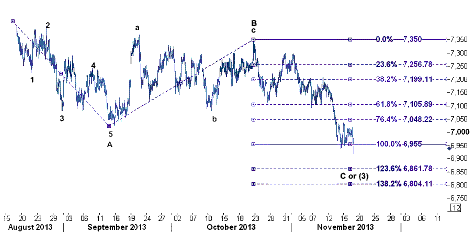 این سطح حمایت همانطور که در نمودار زیر مشاهده می کنید بر روی خط فیبوناچی ۱۰۰ درصدی از موج نزولی C یا موج نزولی (۳) قرار داشت و شکسته شدن این سطح تاییدی در جهت استمرار روند نزولی این موج به سوی محدوده ۶۸۶۲ الی ۶۸۰۴ می باشد که این سطوح به ترتیب بر روی خطوط فیبوناچی ۱۳۸٫۲ و ۱۲۳٫۶ درصدی می باشند.