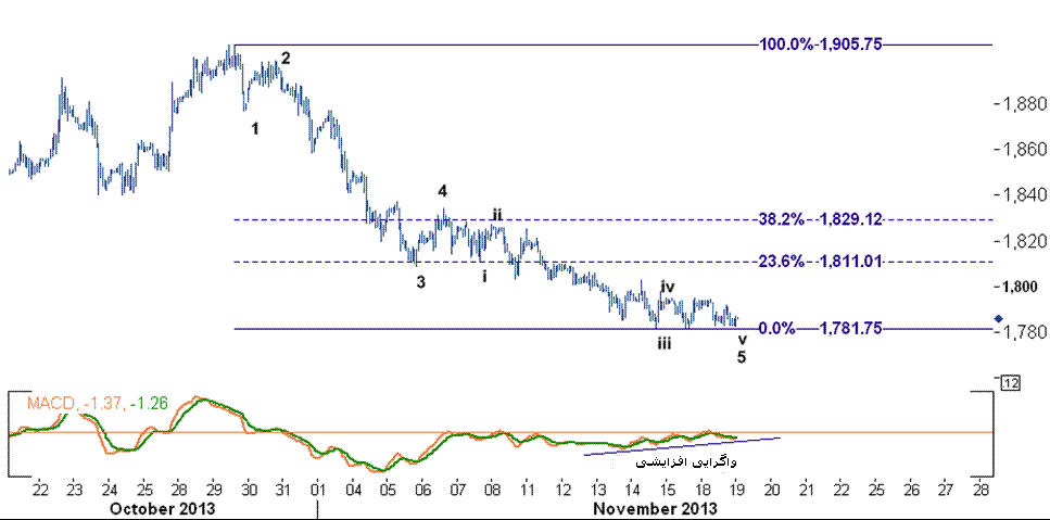 این در حالی است که کاهش قیمت به سطح ۱۷۸۰ موجب استمرار این چرخه از امواج الیوت ویو به سوی سطح ۱۷۷۰ می شود. واگرایی افزایشی بوجود آمده در اندیکاتور یک ساعته MACD بیانگر آن است که حرکت نزولی مقداری برگشت خواهد کرد و بررسی سطوح فیبوناچی از این چرخه هدفی در حدود ۱۸۱۱ را نشان می دهد که تنها در صورت شکست سطح مقاومت ۱۷۹۸ دلار/تن محقق خواهد شد.