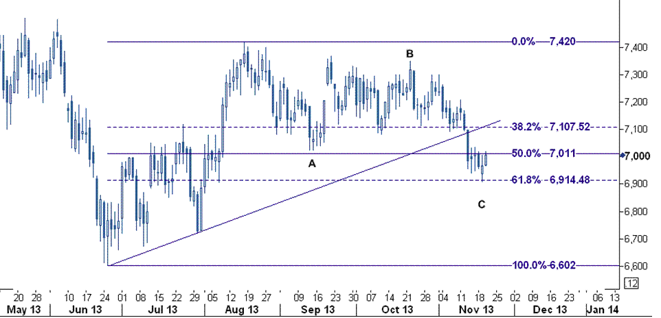 این سطح مقاومت بر روی خط فیبوناچی ۵۰ درصدی از افزایش ۶۶۰۲ ( پایین ترین سطح روز ۲۵ ژوئن) به سطح ۷۴۲۰ ( بالاترین سطح روز ۱۶ اوت) قرار گرفته است که فعلا مانع از افزایش قیمت به سوی سطح ۷۱۰۸ (خط فیبوناچی ۳۸٫۲ درصدی) شده است.