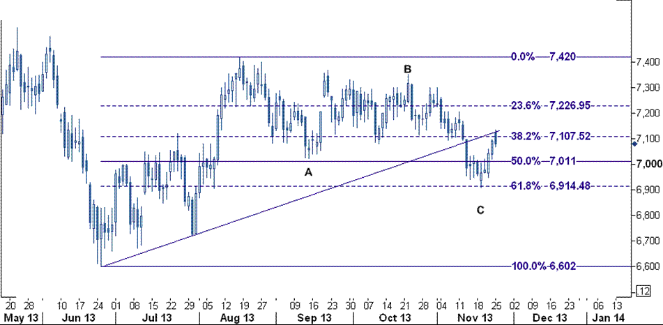 به باور ما این موج افزایشی که از سطح ۶۹۱۰ (پایین ترین سطح روز ۱۱ نوامبر) شاهد آن هستیم صرفا در جهت یک پول بک و عقب نشینی به سوی خط روند کشیده شده می باشد و برای امروز احتمال اینکه این موج برگشتی به سوی سطح ۷۲۲۷ ( خط فیبوناچی ۲۳٫۶ درصدی) گسترش یابد تا حدودی بعید به نظر می رسد.