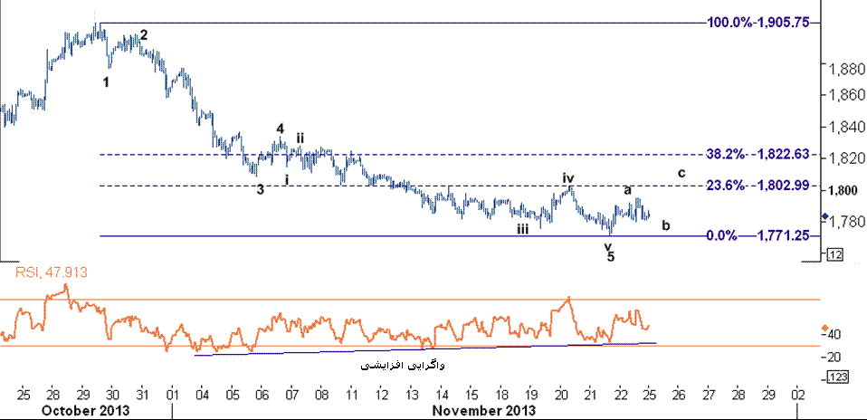 این موج برگشتی پس از تکمیل شدن چرخه پنج موجی از سطح ۱۹۰۵٫۷۵ (بالاترین سطح روز ۲۹ اکتبر) صورت گرفته است و همانطور که در نمودار زیر نیز می بینید اندیکاتور RSI واگرایی افزایشی صادر کرده است که این موضوع موید ادامه حرکت این موج برگشتی قدرتمند به سوی سطح ۱۸۲۳ ( خط فیبوناچی ۳۸٫۲ درصدی) می باشد.