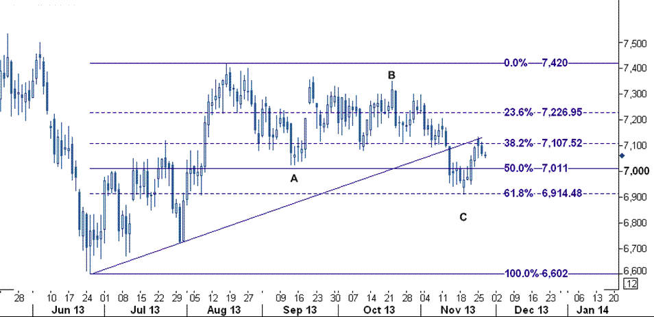 در قیمت جهانی مس در بازار بورس فلزات لندن در چارت زیر مشاهده می شود که کامل شدن حرکت برگشتی از سطح ۶۹۱۰ دلار/تن ( پایین ترین سطح ۱۹ نوامبر) به معنی پایان حرکت بازگشتی و کاهشی قیمت است و موجب شروع روند نزولی به سوی سطح ۷۰۱۱ خواهد شد و بدین جهت همچنان بر تحلیل روز گذشته خود پایبند هستیم.
