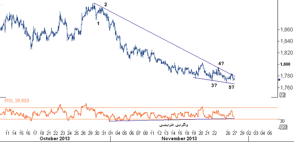 بررسی امواج الیوت بیانگر آن است که قیمت این فلز در آخرین موج نزولی خود از چرخه پنج موجی در حرکت است که این موج به احتمال زیاد در حدود سطح حمایت ۱۷۶۰ ( کف خط روند پایینی) متوقف خواهد شد و واگرایی افزایشی ایجاد شده در اندیکاتور RSI به این سناریو قوت بیشتری بخشیده است.
