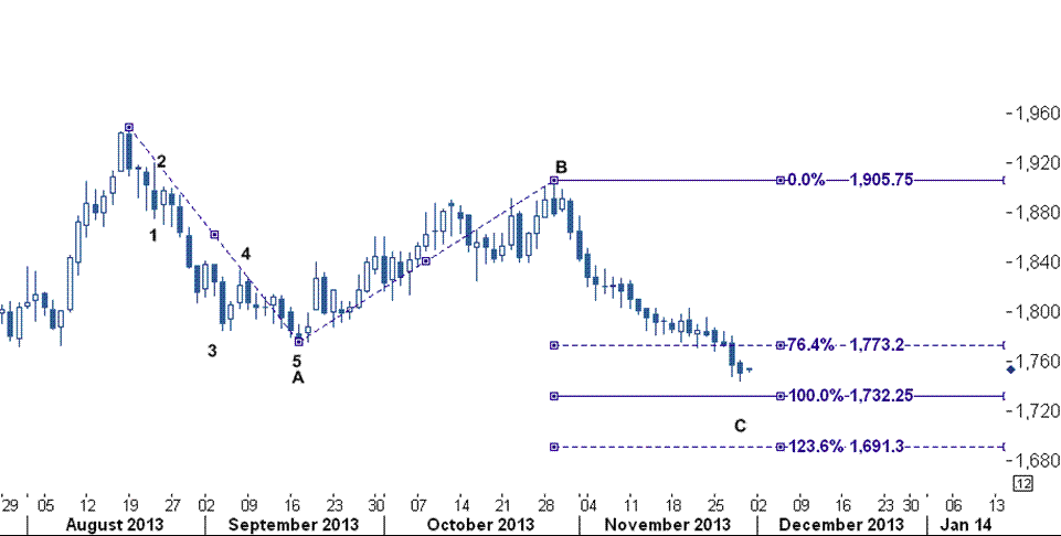 در نمودار زیر کاملا مشخص است که قیمت آلومینیم آلیاژی در موج نزولی C قرار گرفته است که این سومین موج از چرخه سه موجی آغاز شده از سطح ۱۹۴۹ ( بالاترین سطح روز ۱۹ اوت) می باشد .