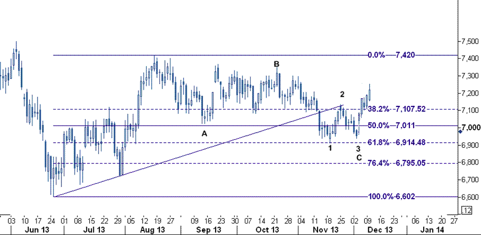 از منظر تحلیل تکنیکال برای تثبیت حرکت صعودی قیمت جهانی مس، چنانکه پیشتر نیز گفته ایم، می بایست قیمت در بالای سطح مقاومت اصلی ۷۱۰۷٫۵۲ تثبیت شود که اگر این حرکت صورت گیرد، می بایست به انتظار صعود تا نرخ ۷۴۲۰ بود که این سطح بر روی بالاترین سطح ۱۶ اوت قرار دارد. با توجه به اینکه الگوی افزایشی همچنان در جریان است، ادامه حرکت صعودی در بالای سطح ۷۱۰۷٫۵۲ نیز امکان پذیر خواهد بود.