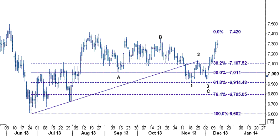 همانگونه که در نمودار زیر به وضوح مشخص شده است این سطح مقاومت بر روی خط فیبوناچی ۳۸٫۲ درصدی قرار داشت که با تثبیت قیمت جهانی مس در بالای این سطح فعلا خریداران کنترل اصلی را در اختیار دارند مگر آنکه به زیر سطح حمایت ۷۱۰۷٫۵۲ برسد که آن وقت می بایست در سناریوی فوق تجدید نظر کرد.