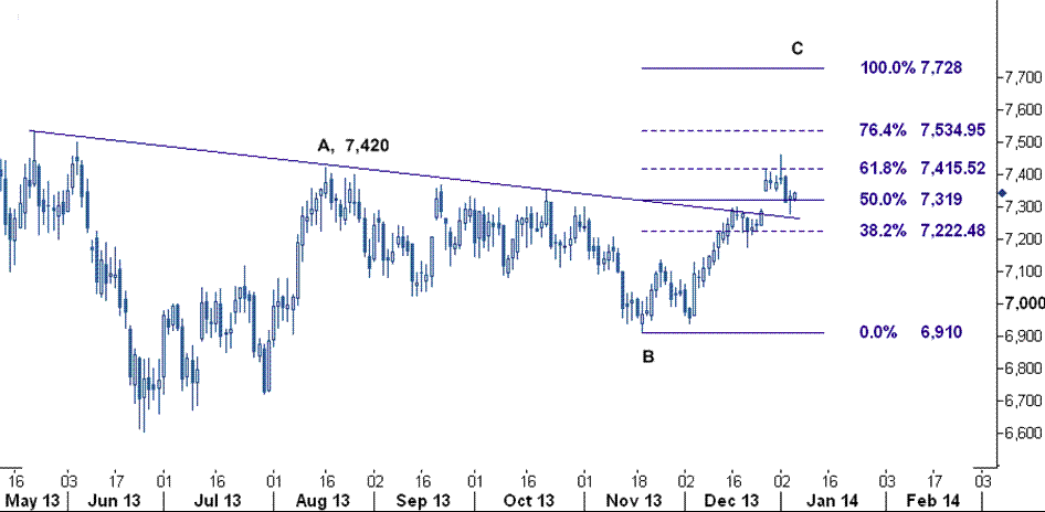 این حرکت برگشتی با سطح مقاومت قیمتی در نرخ ۷۴۱۶ (بر روی خط فیبوناچی ۶۱٫۸ درصدی) مواجه است که در صورت شکست آن می تواند در موج افزایشی C تا حدود ۷۷۲۸ (خط فیبوناچی ۱۰۰ درصدی) تقویت شود.