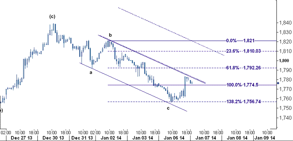 این سطح مقاومت بر روی خط فیبوناچی ۱۰۰ درصدی به وضوح قابل مشاهده است و موج c در اطراف سطح ۱۷۵۶ (پایین ترین سطح روز گذشته) به کف خود رسیده است.