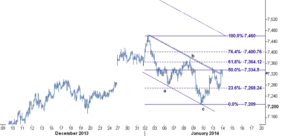 این سطح مقاومت بر روی خط فیبوناچی ۵۰ درصدی از کاهش ۷۴۶۰ (بالاترین سطح روز ۲ ژانویه) به ۷۲۰۹ ( پایین ترین سطح روز ۹ ژانویه) واقع شده است و شاخصهای تکنیکال نیز اشاره به حرکت کندتر و منطقیتر در زیر این سطح مقاومت دارند و تنها به شرط شکسته شدن این سطح احتمال افزایش قیمت به سطح ۷۴۰۱ وجود دارد که این سطح بر روی خط فیبوناچی ۷۶٫۴ درصدی می باشد.