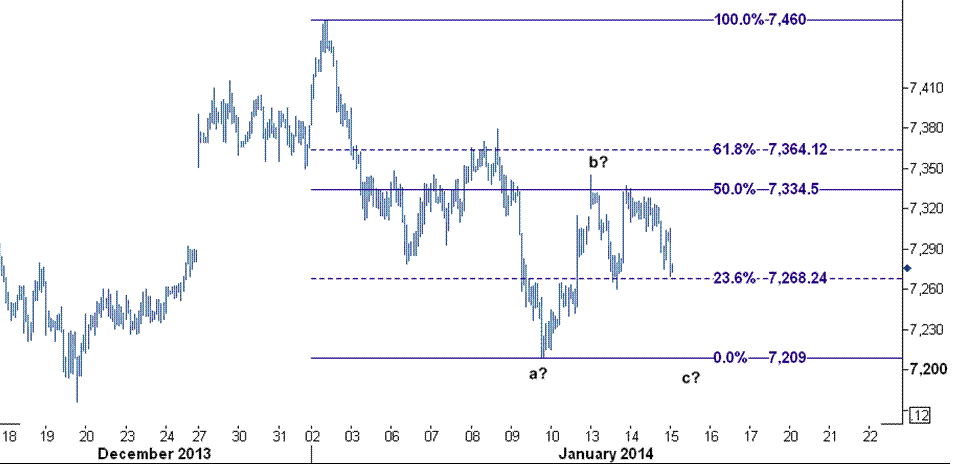 این محدوده خنثی بین سطوح ۲۳٫۶ درصدی و ۵۰ درصدی فیبوناچی از کاهش ۷۴۶۰ (بالاترین سطح روز ۲ ژانویه) به ۷۲۰۹ ( پایین ترین سطح روز ۹ ژانویه) شکل گرفته است که در نمودار زیر مشخص گردیده است.