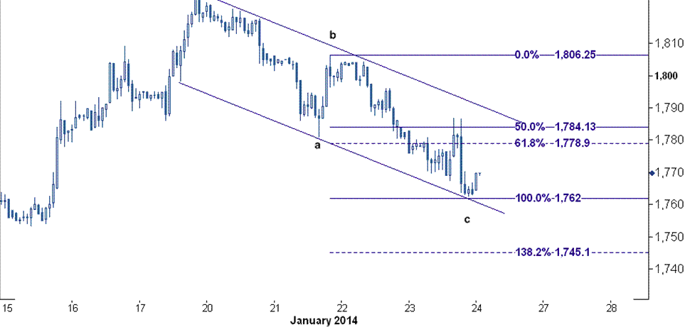 این سطح حمایت بر روی خط فیبوناچی ۱۰۰ درصدی از موج نزولی c مشخص است و تنها به شرط شکسته شدن این سطح موجب تایید سیر نزولی قیمت به سوی سطح ۱۷۴۵ می باشد که این سطح بر روی خط فیبوناچی ۱۳۸٫۲ درصدی قرار گرفته است .
