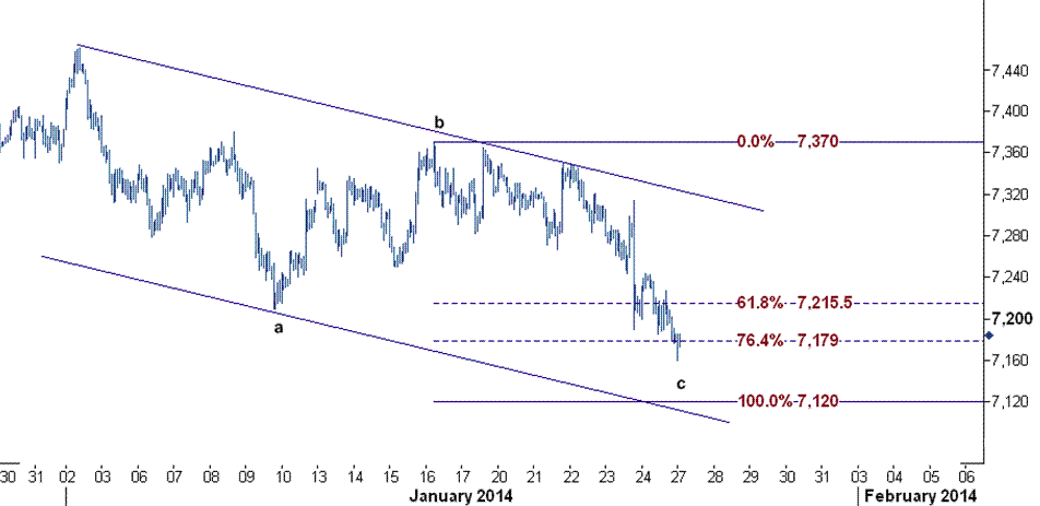 همانطور که در نمودار زیر دیده می شود این سومین موج از چرخه سه موجی قیمت می باشد که از سطح ۷۴۶۰ (بالاترین سطح روز ۲ ژانویه) شروع شده است و تحلیل سطوح فیبوناچی هدف ۷۱۲۰ را نشانه گرفته است که این سطح بر روی خط فیبوناچی ۱۰۰ درصدی قابل رویت می باشد که این سطح نیز مماس با ضلع پایینی کانال کاهشی می باشد.