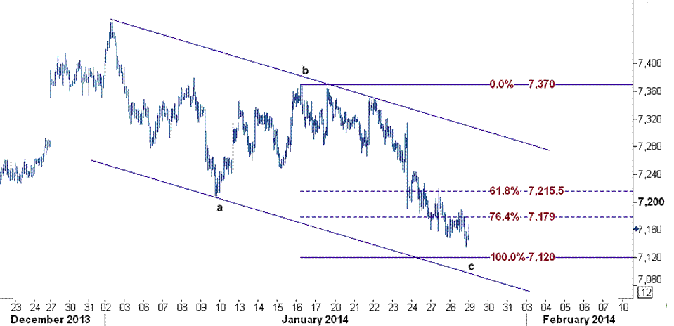 همانطور که در نمودار زیر مشخص است این سومین موج از چرخه سه موجی از سطح ۷۴۶۰ ( بالاترین سطح روز ۲ ژانویه) می باشد. به باور ما این موج می تواند به اندازه ی طول موج قبلی یعنی موج a حرکت کند.
