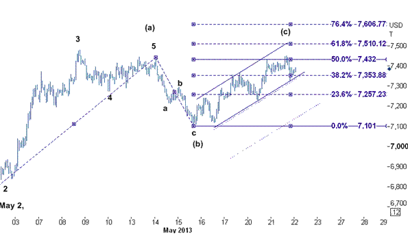 برای قیمت جهانی مس در بازار بورس فلزات لندن تحلیل روز گذشته همچنان معتبر است و با توجه به اینکه قیمت هم اکنون در موج افزایشی (c) قرار گرفته است ، انتظار داریم قیمت تا زمانیکه بالای سطح حمایت ۷۳۲۸٫۵۰ ( پایین ترین سطح روز سه شنبه ) قرار دارد ، به سوی سطح ۷۵۱۰ دلار/ تن افزایش یابد. در چارت پایین مشاهده می شود که این سومین موج از حرکت سه موجی الیوت است که از سطح ۶۷۸۰ ( پایین ترین سطح روز ۲ مه ) افزایش داشته است.