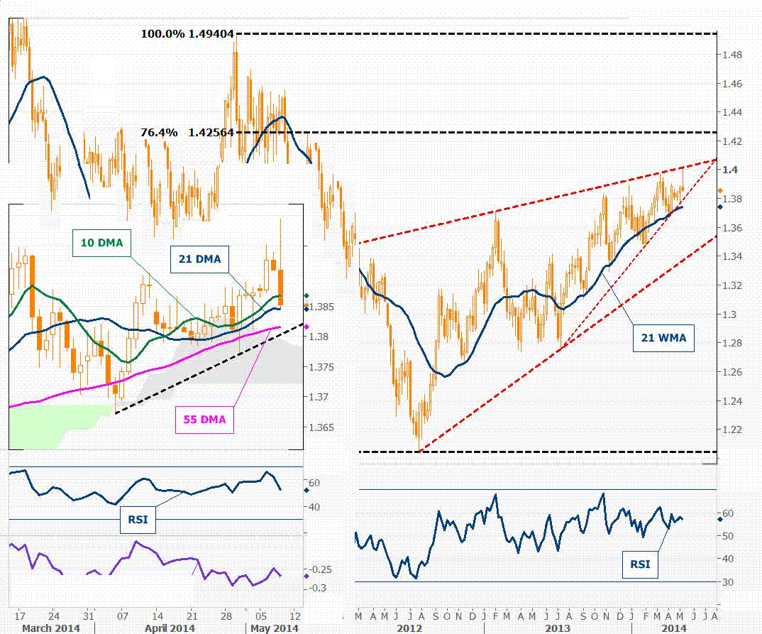 در نمودار زیر مشخص است که قیمت ۱٫۳۸۳۰ برای یورو (اطراف خط میانگین متحرک ۲۱ روزه) نقش یک محدوده حمایتی بسیار محکمی را ایفا خواهد کرد و اگر بتواند پایین این خط تثبیت شود، می توانیم به قیمتهای ۱٫۳۸۱۶ (خط میانگین متحرک ۵۵ روزه) و ۱٫۳۸۱۲ (پایین ترین سطح روز ۲ مه) و ۱٫۳۸۰۰ هم امیدوار باشیم.