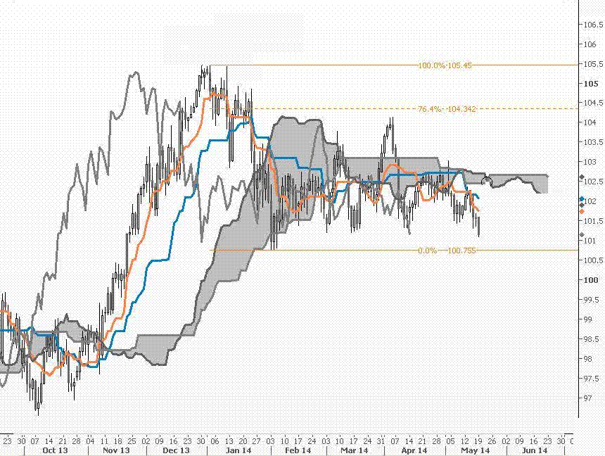 در شرایط حاضر، انتظار داریم روند کاهشی دلار در برابر ین ژاپن باز هم ادامه داشته باشد و عبور قیمت از سطح ۱۰۱٫۰۰ به ترتیب هدفهای ۱۰۰٫۷۶ (پایین ترین سطح روز ۴ فوریه ۲۰۱۴) و ۱۰۰٫۶۳ (پایین ترین سطح روز ۱۱ سپتامبر ۲۰۱۳ و خط فیبوناچی ۵۰ درصدی) را مشخص می کند.