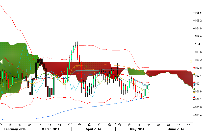 بدین ترتیب از اینجا می بایست انتظار بازگشت قیمت به نرخ ۱۰۱٫۵۹ (پایین ترین سطح روز ۲۳ مه) یا حتی ۱۰۱٫۳۶ و ۱۰۱٫۳۳ را داشته باشیم.