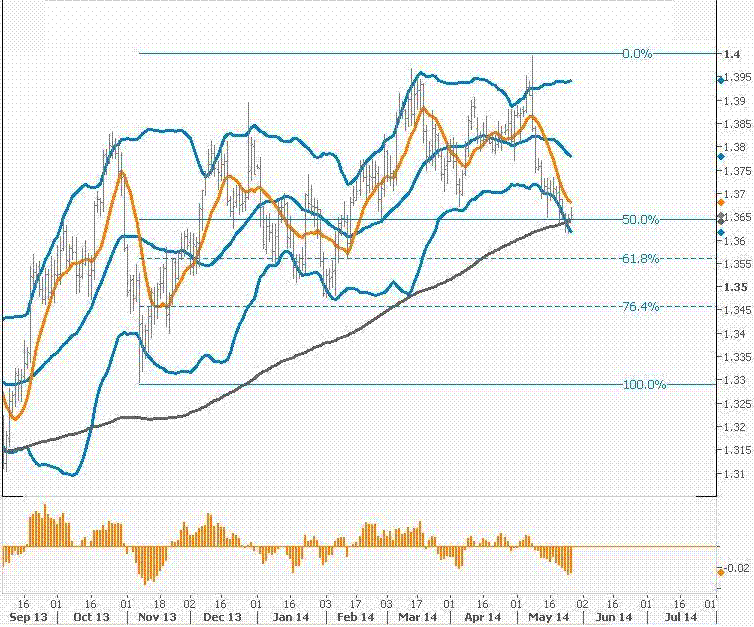 در نمودار زیر مشخص شده است که خط تنکان سن بر روی نرخ ۱٫۳۶۷۵ بر دوش یورو سنگینی می کند و به احتمال زیاد بسته شدن قیمت در زیر سطوح ۱٫۳۶۴۵ (خط فیبوناچی ۵۰ درصدی از ۱٫۳۲۹۵ به ۱٫۳۹۹۵) و ۱٫۳۶۴۰ (خط میانگین متحرک ۲۰۰ روزه) می تواند زمینه را برای سقوط دیگر در آستانه جلسه بانک مرکزی اروپا (ECB) در روز ۵ ژوئن فراهم آورد و هرچند اکنون زمان مناسبی برای آن نیست اما باید بدقت مراقب آن باشیم.